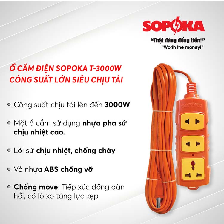 Giới thiệu Ổ cắm điện SOPOKA 4S T-3000W công suất lớn siêu chịu tải dây dài 3m 5m 10m Chính Hãng