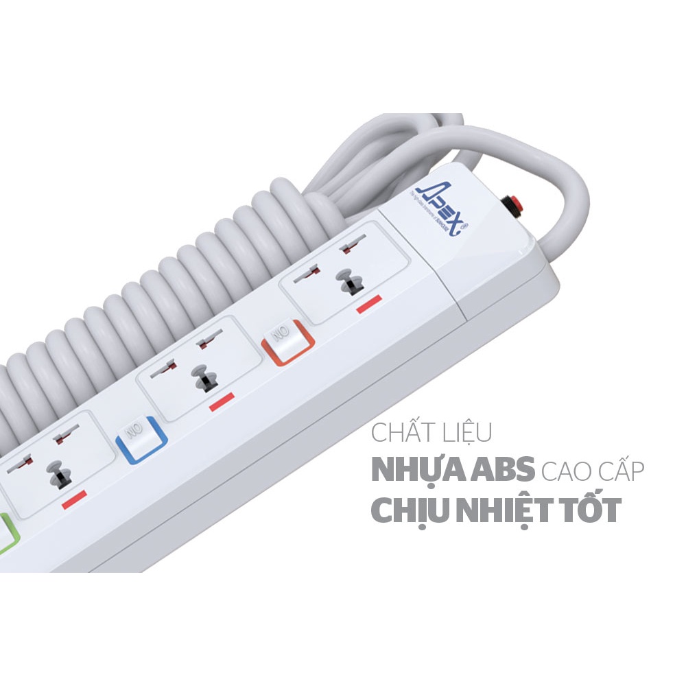 Ổ cắm điện APE-OC2-5RD thiết kế nhỏ gọn gồm 5 ổ cắm 3 chấu với 5 đèn báo và công tắc riêng, ngoài ra chiều dài dây lên đến 4,5m giúp dễ dàng sử dụng ở những không gian rộng.
