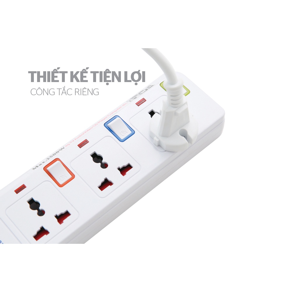 ✔ 3 chấu cắm, 2 sạc USB thiết bị di động, chiều dài dây 2.5m