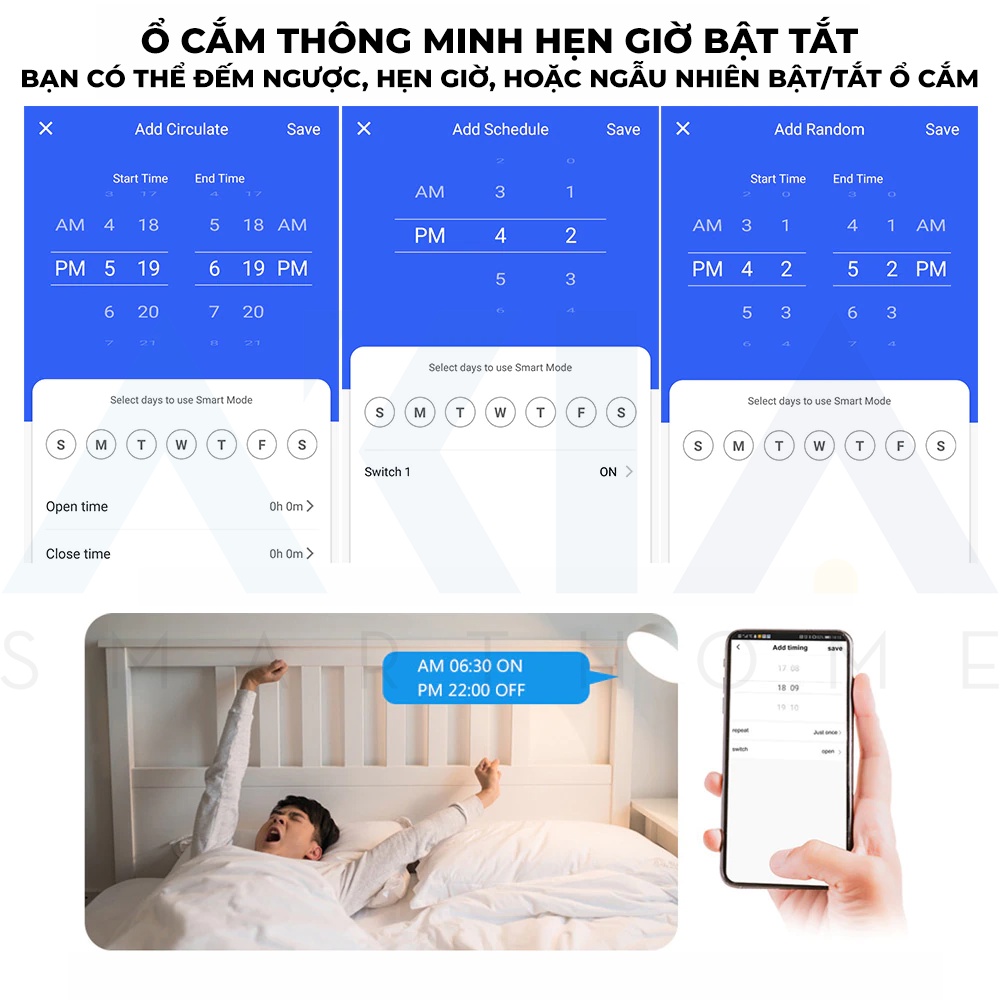 - Chức năng hẹn giờ: Bạn có thể đặt bộ hẹn giờ để bật/tắt thiết bị điện tử của mình hoặc đặt bộ hẹn giờ để bật tắt một thiết bị nhà bếp ví dụ như máy nấu nước uống.