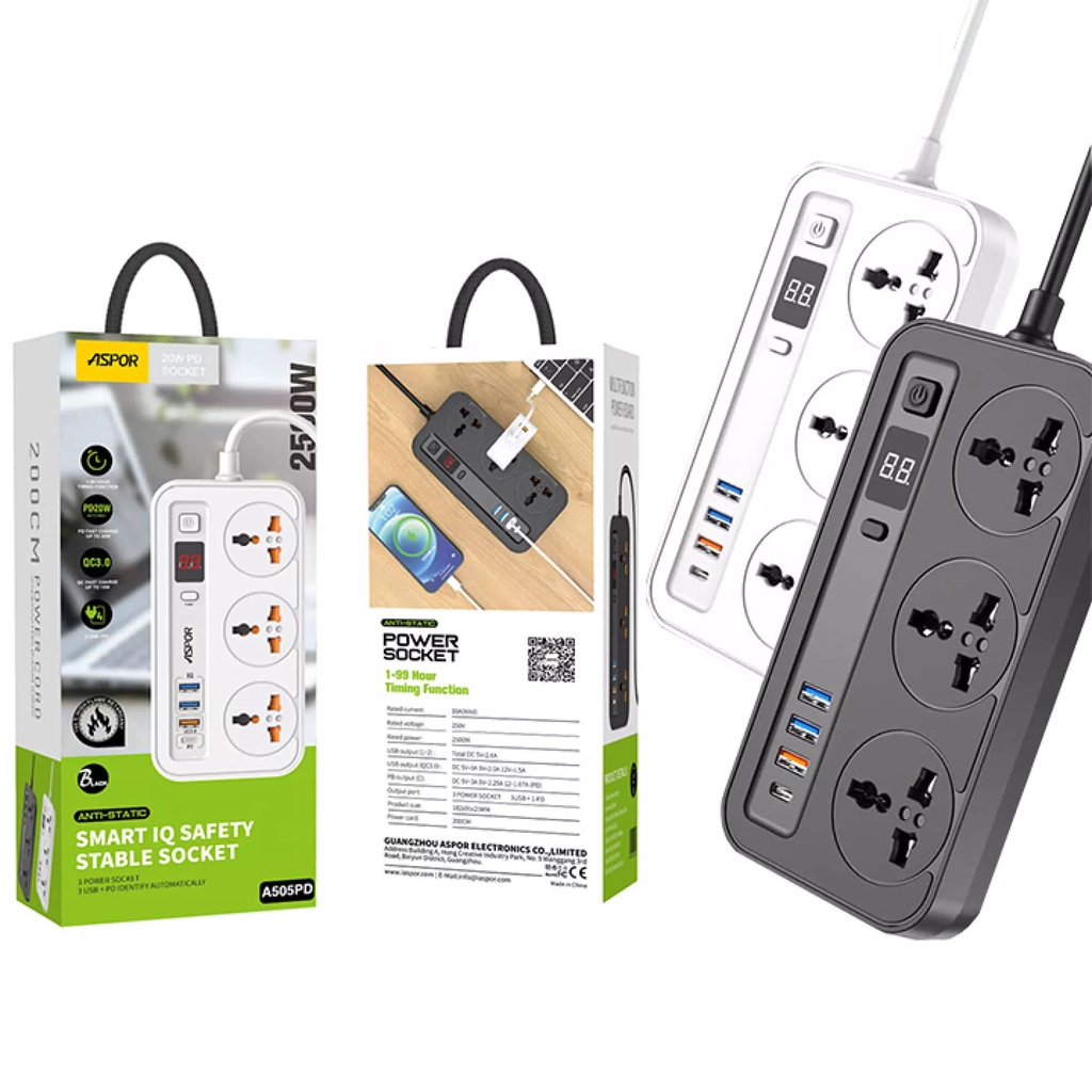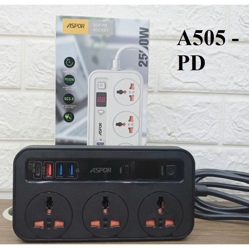 Ổ Cắm Điện Thông Minh Chống Giật ASPOR A505PD, Ổ Điện Đa Năng 3 Cổng Cắm 250V 3 Cổng USB 1 Cổng PD 20W, Dây dài 2m