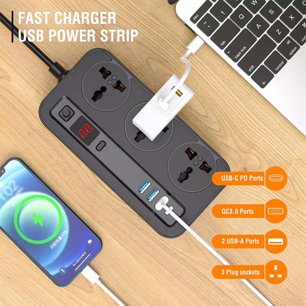 ✅ 3 cổng 220V chân đa năng (cắm được cả ổ 3 chân vuông, 3 chân chéo, 2 chân chéo / tròn … nói chung là cắm được tất cả các thiết bị điện) Thiết kế thông minh có nắp ngăn nước, chống trẻ em nghịch…