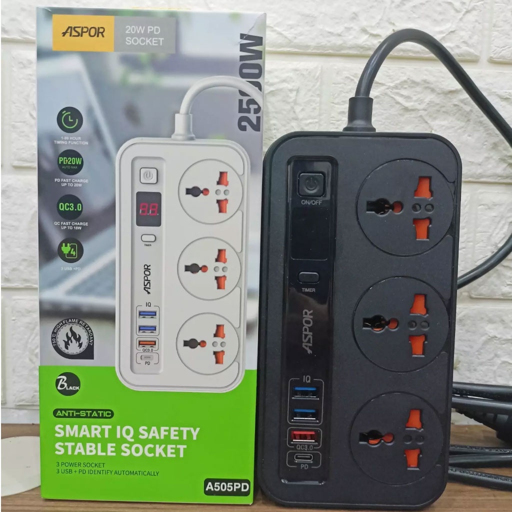 Thiết Bị Điện Gia Dụng > Mạch điện & Phụ tùng > Ổ cắm điện & Dây nối || Ổ Cắm Điện Thông Minh Chống Giật ASPOR A505PD, Ổ Điện Đa Năng 3 Cổng Cắm 250V 3 Cổng USB 1 Cổng PD 20W, Dây dài 2mCòn hàng