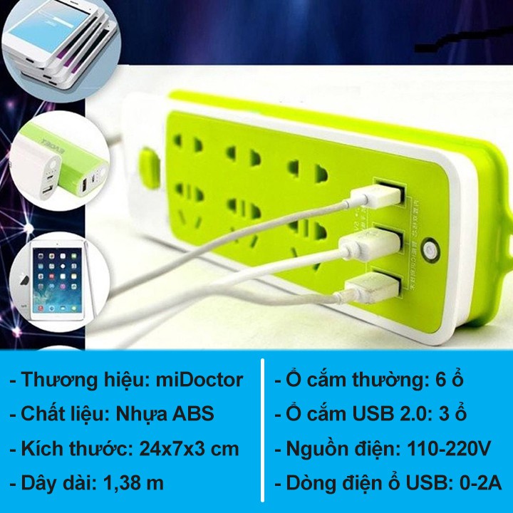 Ổ Cắm Điện Thông Minh Đa Năng Chống Giật 6 Cổng Thường, 3 Cổng USB, Có Đèn Báo và Công Tắc Bật/Tắt