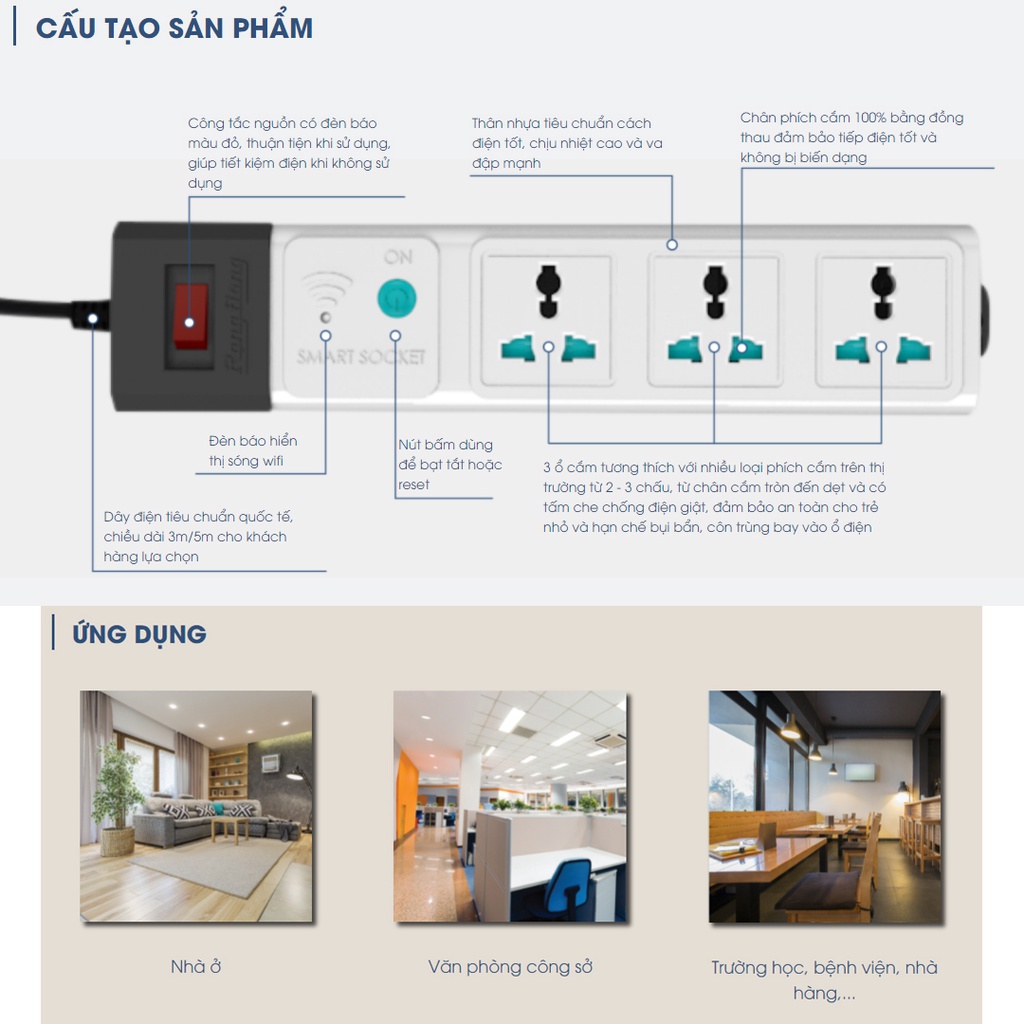 Thông số kĩ thuật Ổ cắm điện thông minh Rạng Đông điều khiển từ xa bằng Wifi, tương thích với mọi loại phích cắm, dây dài 3m/5m:
