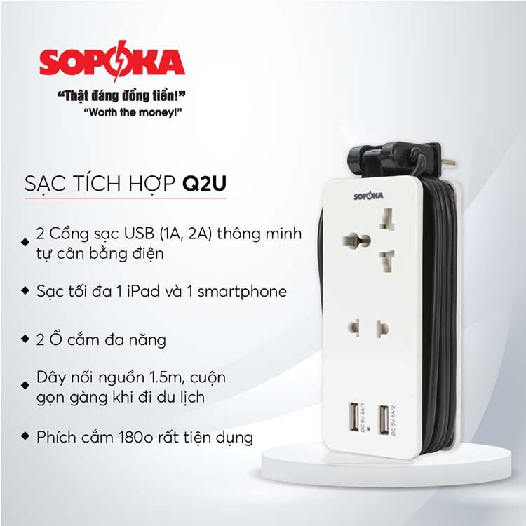 Ổ cắm điện thông minh SOPOKA tích hợp cổng USB là sản phẩm có thiết kế độc đáo, nhỏ gọn, tinh tế gồm:-2 cồng sạc USB (1A,2A) thông minh tự cân bằng điện