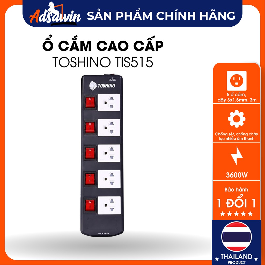 Thiết Bị Điện Gia Dụng > Mạch điện & Phụ tùng > Ổ cắm điện & Dây nối || Ổ cắm điện TOSHINO Thái Lan mỗi ổ có 1 công tắc tắt bật, ổ chống sét, lọc nhiễu dòng điện TIS515 dài 3M- TIS515Còn hàng