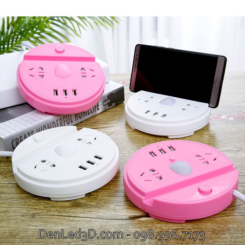 Ổ Cắm Điện Tròn R23 3 Cổng USB Chống Giật, Có Đèn Ban Đêm, Kèm Đế Điện Thoại, Chịu Tải 2500W