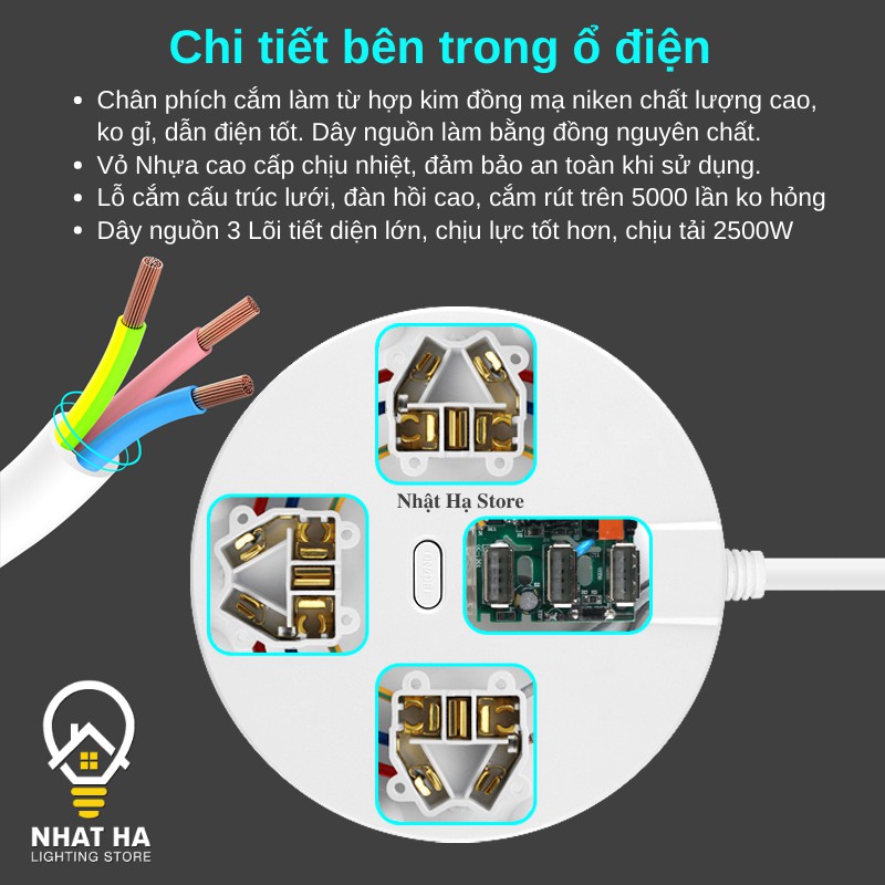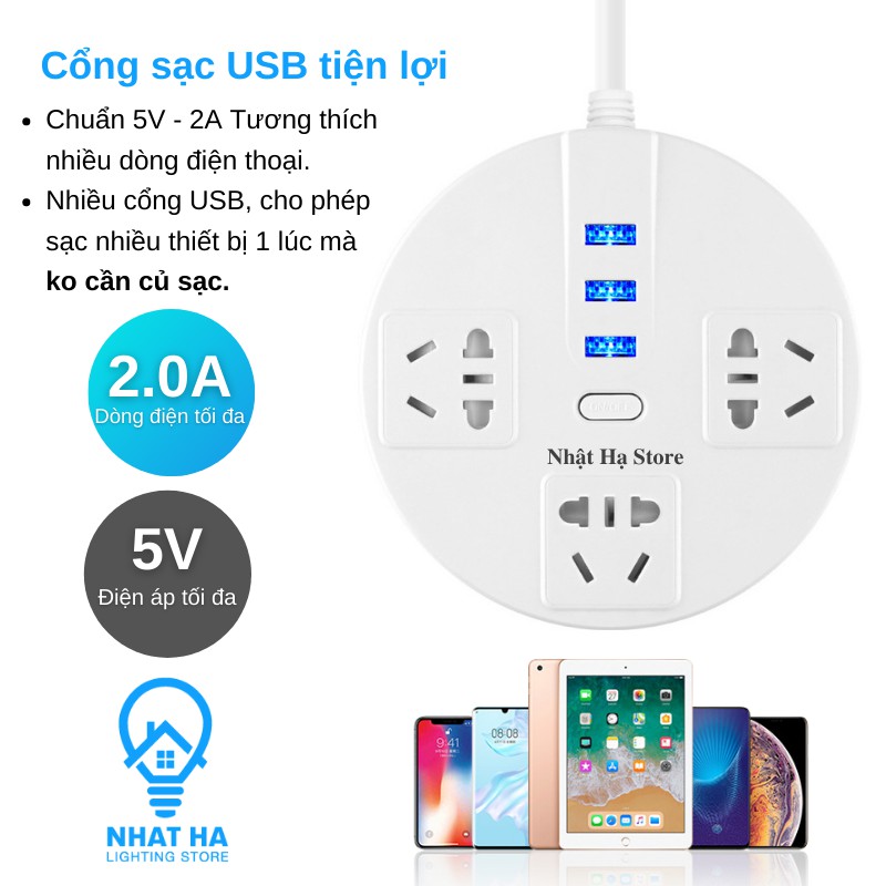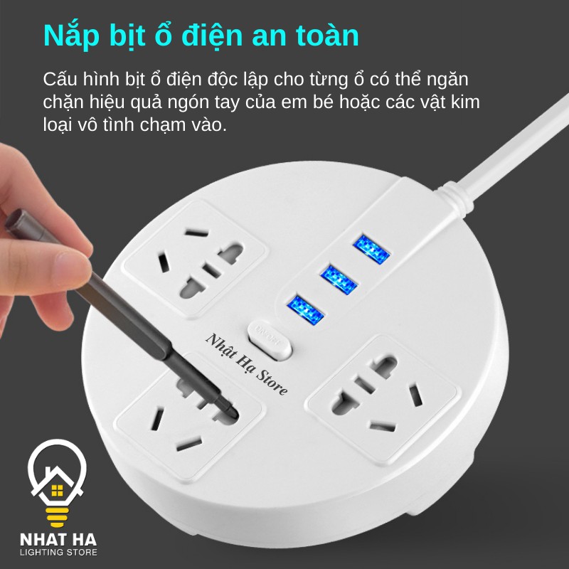 Giới thiệu Ổ Cắm Điện USB Đa Năng Tròn Dây Dài 3m Có Nắp Bịt An Toàn Chống Giật Chịu Tải Lớn 2500W