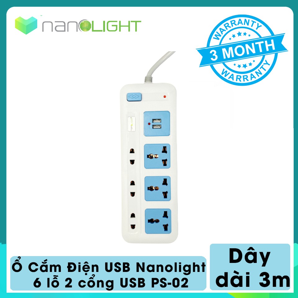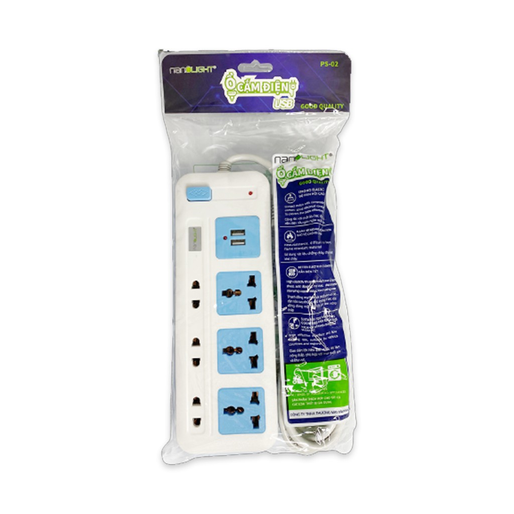 Ổ Cắm Điện USB Nanolight 6 lỗ cắm và 2 cổng USB PS-02 có vỏ ngoài được làm từ chất liệu nhựa ABS bền đẹp, có khả năng chịu nhiệt cao. Lỗ cắm bằng đồng có tính đàn hồi cao, đảm bảo không lỏng lẻo nên tiếp xúc tốt, không đánh lửa, an toàn tuyệt đối cho người sử dụng.•Thiết kế 6 lỗ cắm và 1 công tắc tiêuvà 2 cổng USB chuẩn phù hợp với mọi loại phích cắm có trên thị trường sẽ giúp bạncung cấp điện cho nhiều thiết bị cùng lúc một cách tiện lợi. Khoảng cách giữacác ổ cắm rộng, giúp cắm được các loại phích bản rộng khác nhau.