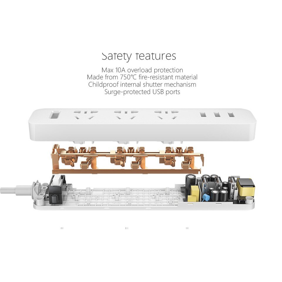 -Hỗ trợ sạc nhanh với 3 cổng USB cho dòng điện 2A: Trên mỗi ổ cắm Mi power strip tích hợp cổng USB, nhà sản xuất trang bị thêm 3 cổng USB với dòng ra 5V-2A, đi cùng với khả năng tự điều chỉnh dòng điện cho phù hợp với thiết bị. Giúp thiết sạc luôn được an toàn, tránh trường hợp quá dòng quá áp, gây hại cho thiết bị hoặc thậm chí gây ra cháy.