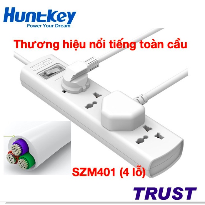 Ổ cắm điện đa năng chống sét Huntkey SZM401 - 2500W, 4 lỗ 3 chân đa năng, chống sét, cáp 1.5m -HÀNG NHẬP KHẨU