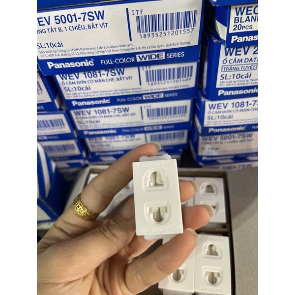 CHI TIẾT SẢN PHẨM Tên sản phẩm:Ổ cắm đơn Model:WEV1081SW Thương hiệu:Panasonic Đơn vị tính:Cái Điện áp:250 VAC - 16A Quy cách:Đóng gói 10 cái / hộp, 100 cái / thùng Ổ cắm:đơn có màn che Panasonic thương hiệu thiết bị điện hàng đầu thế giới, với kinh nghiệm sản xuất, phân phối các sản phẩm thiết bị điện cho các công trình xây dựng. Trong đó, dòng sản phẩm Wide Series đến từ thương hiệu Nhật Bản này có thiết kế đơn giản, tinh tế mà không kém phần sang trọng với 2 màu cơ bản là trắng và xám, công tắc dòng Wide thường đi cùng với đèn báo OFF tiện dụng và tạo điểm nhấn nhất định cho căn phòng. Dòng sản phẩm Wide Series dòng sản phẩm công tắc ổ cắm với nhiều ưu điểm: đa dạng về mẫu mã, chức năng ổn định, độ an toàn cao và giá thành phù hợp với mọi đối tượng khách hàng cũng như công trình. Ổ cắm đơn Panasonic WEV1081 – Dòng Wide Series Ổ cắm đôi WEV1081 Panasonic dòng Wide Series màu trắng, 2 chấu, được sản xuất tại Thái Lan theo dây truyền công nghệ hiện đại. Sản phẩm có độ bền cao, panasonic