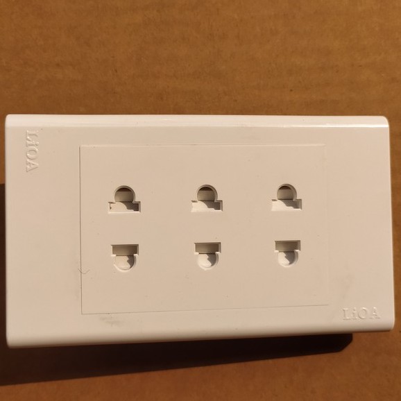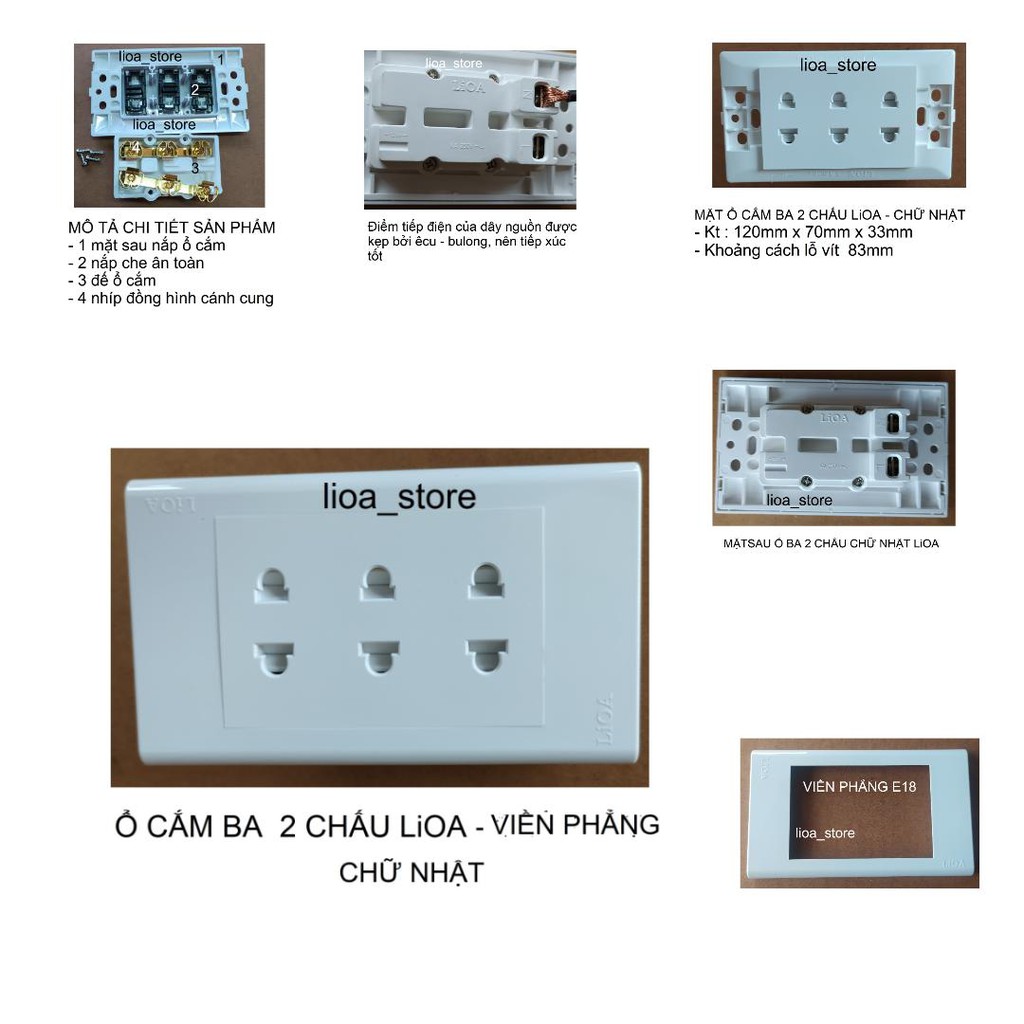 - Ổ CĂM( ĐƠN,ĐÔI, BA) 2 CHẤU CHỮ NHẬT LiOA được hình thành bởi 3 phần ( viền, mặt và đế ). được gắn bởi các chốt, khớp nhựa và vít rất chắc chán và an toàn.Viền, mặt và đế đều màu trắng có đập chữ nổi ( LiOA) , bên trong ghi mã sản phẩm. Mặt ngoài dập chữ nổi và ghi thương hiệu trên sản phẩm , để tránh hàng nhái, hàng giả.
