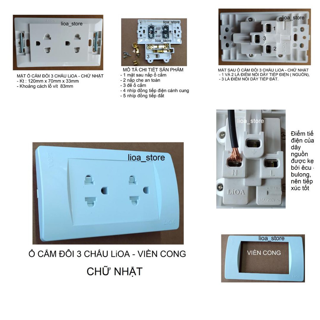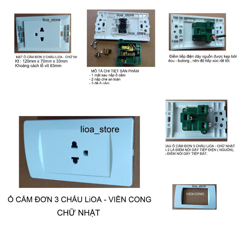 - Ổ CĂM ĐƠN(,ĐÔI,) 3 CHẤU CHỮ NHẬT LiOA được hình thành bởi 3 phần ( viền, mặt và đế ). được gắn bởi các chốt, khớp nhựa và vít rất chắc chán và an toàn.Viền, mặt và đế đều màu trắng có đập chữ nổi ( LiOA) , bên trong ghi mã sản phẩm. Mặt ngoài dập chữ nổi và ghi thương hiệu trên sản phẩm , để tránh hàng nhái, hàng giả.