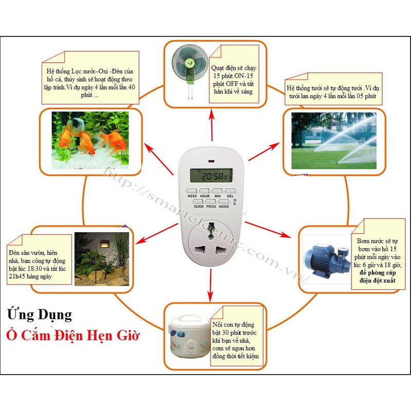 Hẹn giờ cho các thiết bị gia đình như Tivi, Đầu Máy, Radio... (bởi vì khi tắt bằng remote thì nguồn điện vẫn còn, làm hao phí điện năng, tránh tình trạng cháy nổ khi có sấm sét, chập điện...)