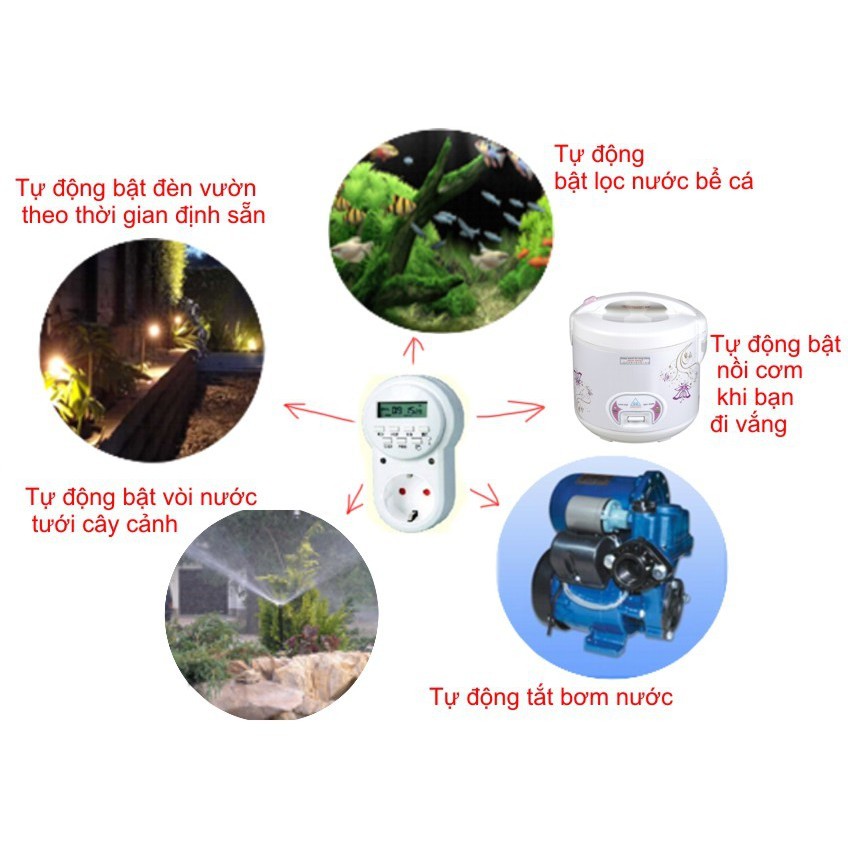 Hẹn giờ tự động thiết bị điện trong nhà: đèn, quạt, motor bơm nước, lọc nước thủy sinh, tưới cây tự động.Chỉ cài đặt một làn và ổ cắm hẹn giờ ETG-63A hẹn giờ tắt mở tự động các thiết bị với thời gian hẹn sẵn.