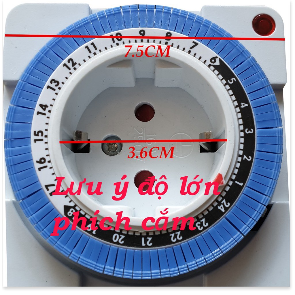 _ Nút đỏ bên hông ổ cắm gạt xuống hình đồng hồ là sử dụng ổ cắm ở chế độ hẹn giờ. Nếu gạt lên chữ ON là sử dụng ổ cắm như một phích nối- tức là không hẹn giờ.