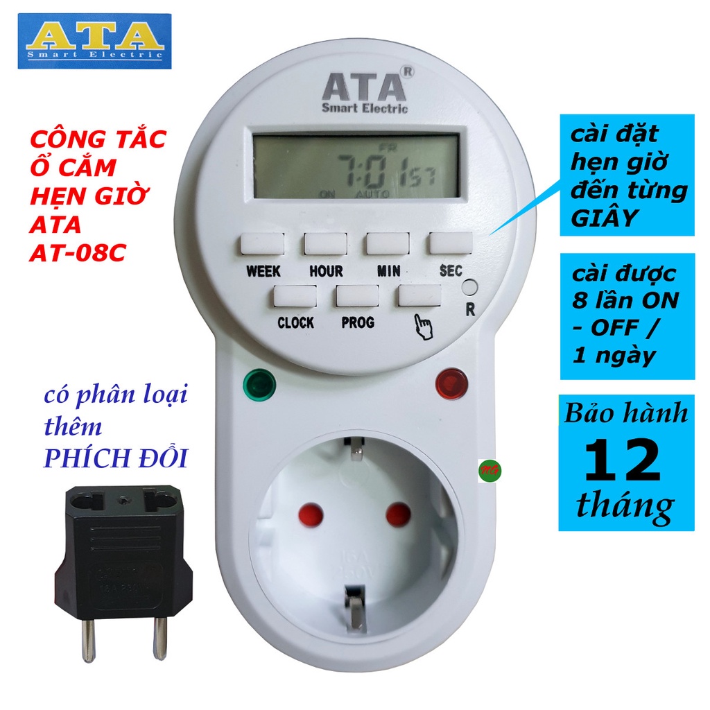 Thiết Bị Điện Gia Dụng > Mạch điện & Phụ tùng > Ổ cắm điện & Dây nối || Ổ cắm hẹn giờ tắt mở thiết bị điện kiểu điện tử chỉnh được giây ATA AT-08CCòn hàng