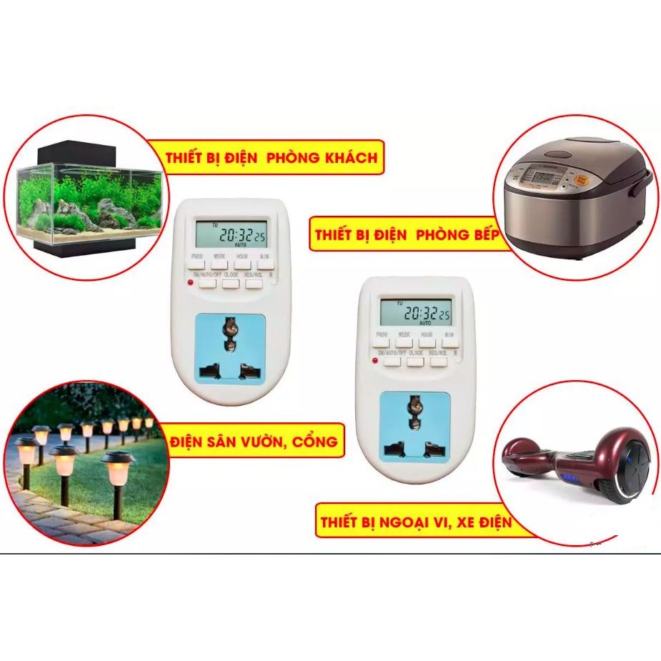 - Hẹn giờ cho các thiết bị gia đình như Tivi, Đầu Máy, Radio... (bởi vì khi tắt bằng remote thì nguồn điện vẫn còn, làm hao phí điện năng, tránh tình trạng cháy nổ khi có sấm sét, chập điện...)