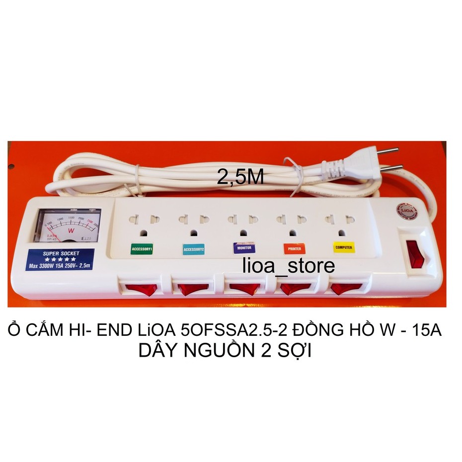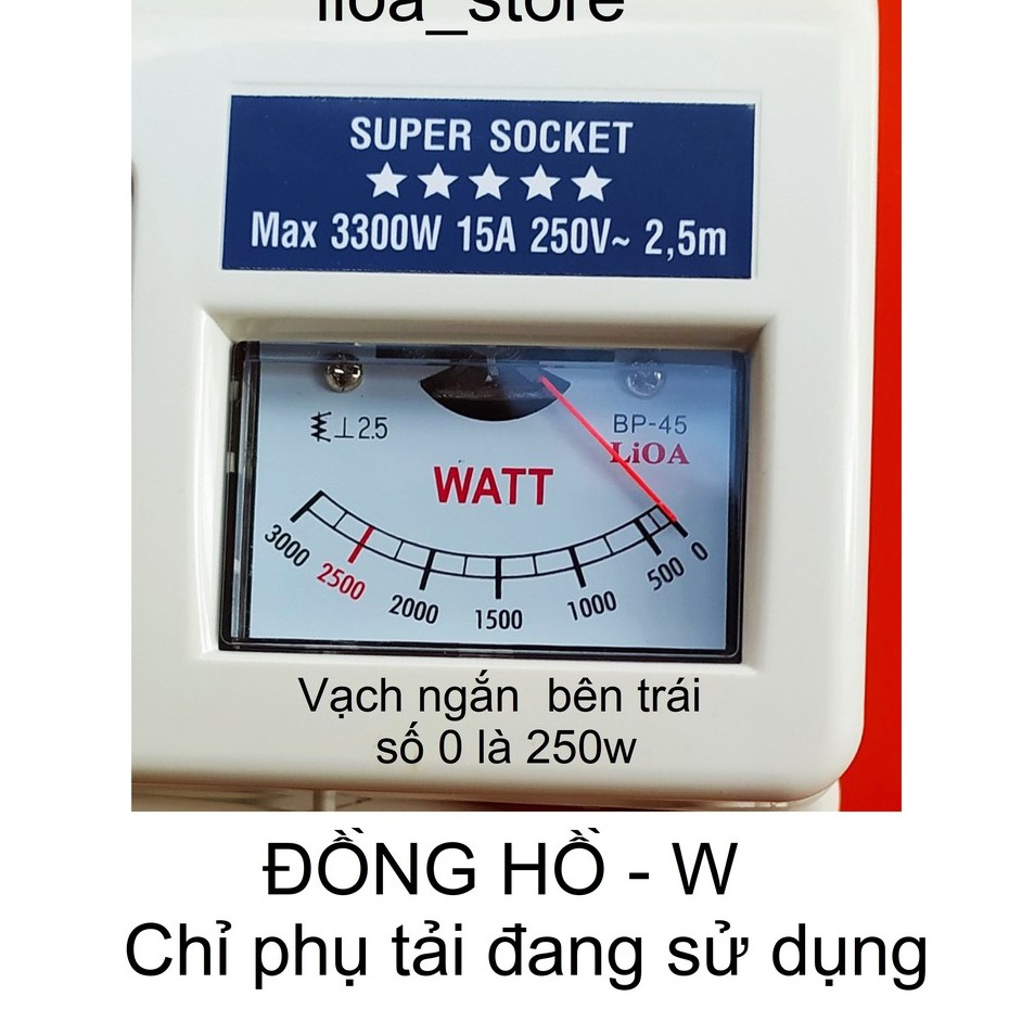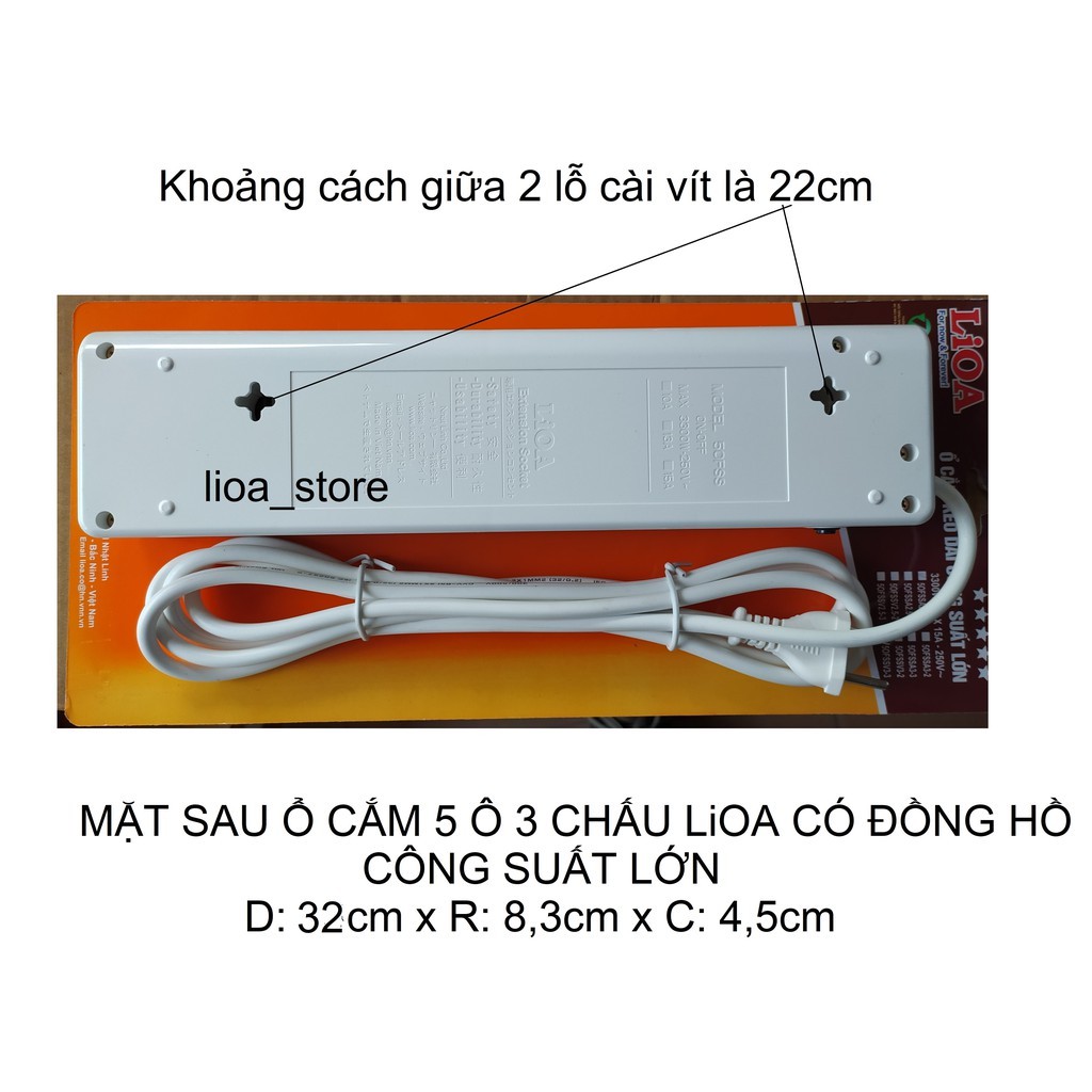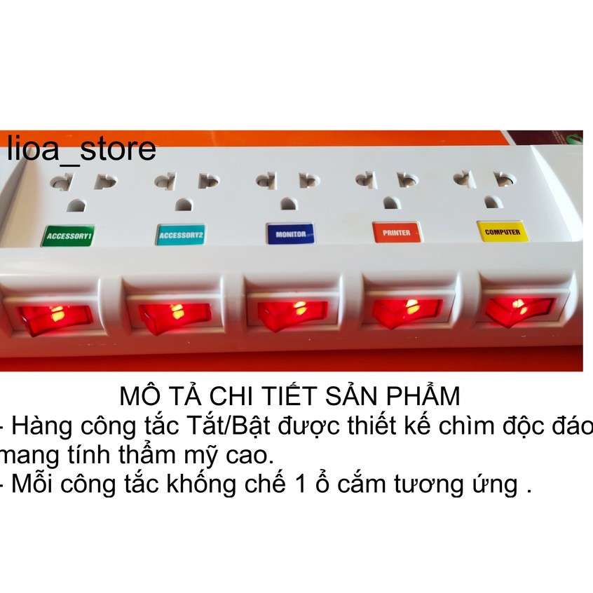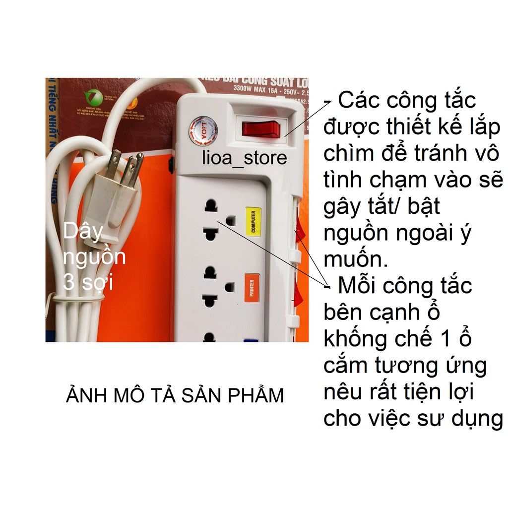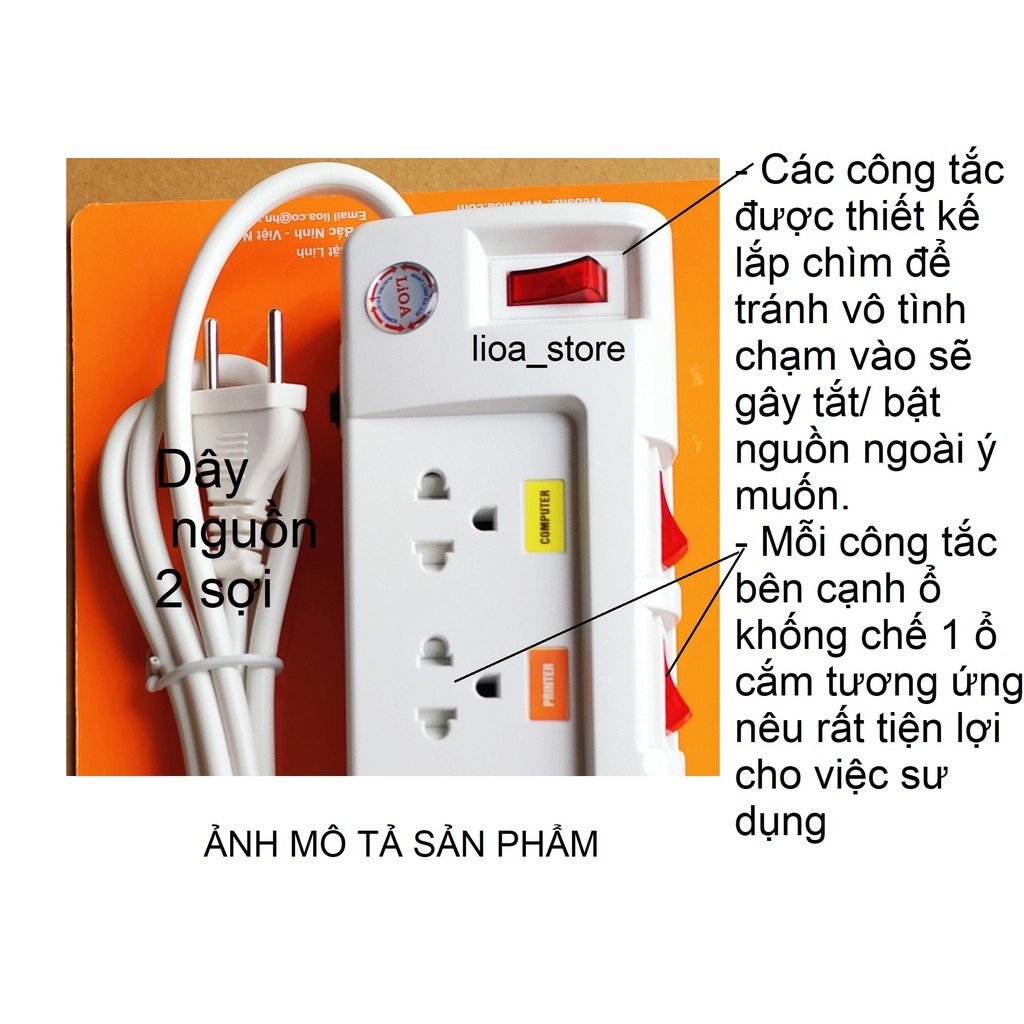 -Thân ổ cắm màu trắng có gắn thương hiệu LiOA . Trên Mỗi ổ cắm được ghi chú tên thiết bị và ổ tương ứng khác nhau giúp cho người sử dụng phân biệt được dễ ràng khi dùng nhiều thiết bị cùng 1 lúc. ( để tránh hàng giả hàng nhái)., các ổ cắm dều có nắp che AN TOÀN . ( tránh trường hợp nhà có trẻ con vô ý thò tay vào ổ cắm khi đang có điện . khoảng cách giữa các ổ là đảm bảo cắm được các phích có bản to.