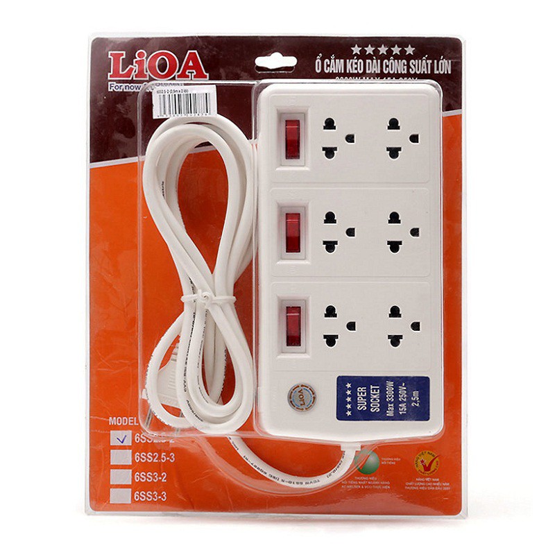 Ổ cắm kéo dài cao cấp ba chấu Super Công Suất Lớn LiOA 6SS2.5-3 (2.5m x 3 Lõi)