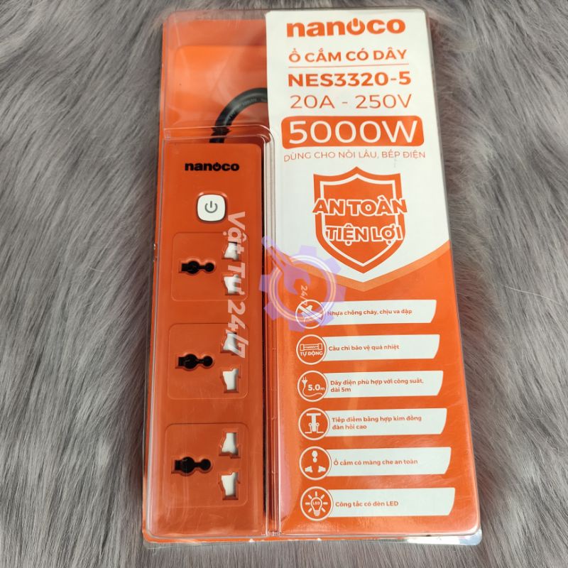 Thiết Bị Điện Gia Dụng > Mạch điện & Phụ tùng > Ổ cắm điện & Dây nối || Ổ cắm kéo dài có dây 5m Nanoco NES3320-5 20A 3 lỗ đa năng công suất lớn 5000W cao cấp có màn che dùng bếp điện nồi lẩuCòn hàng