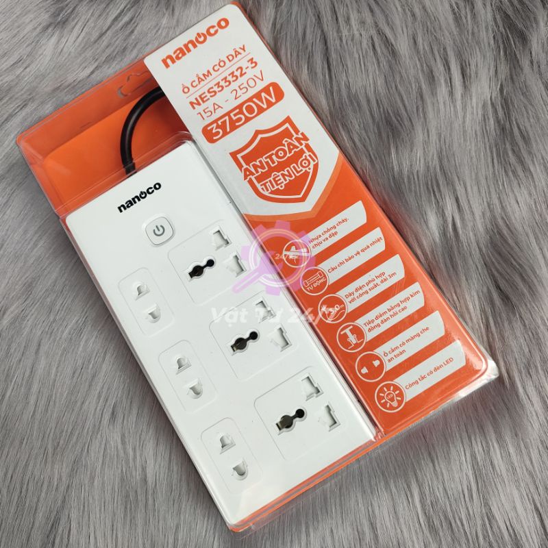Ổ cắm kéo dài có dây Nanoco NES3332-3 15A 6 lỗ cắm cao cấp và an toàn 3 lỗ 2 chấu 3 lỗ 3 chấu có màn che bậc nhất trên thị trường hiện nay với những ưu điểm như:✅Được sản xuất tại Việt Nam với công nghệ tiên tiến loại bỏ hoàn toàn các trường hợp mất an toàn thường hay gặp phải đối với các thiết bị ổ cắm kéo dài thông dụng khác.
