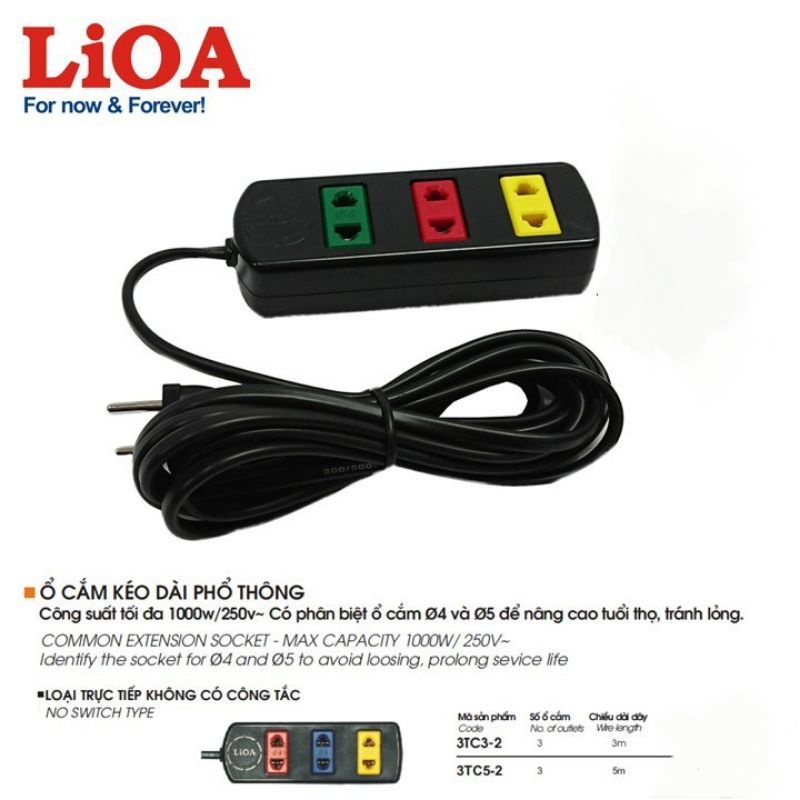 Giới thiệu Ổ cắm kéo dài không công tắc LIOA 3 ổ 3 mét 3TC3-2 / 5 mét 3TC5-2