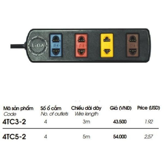 Giới thiệu Ổ cắm kéo dài phổ thông LIOA 4TC5-2 (4 ổ cắm - dây dài 5 mét)