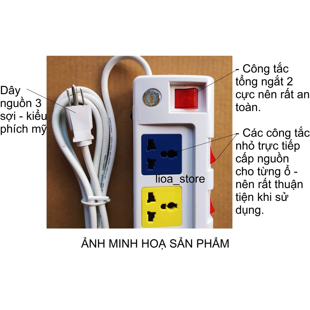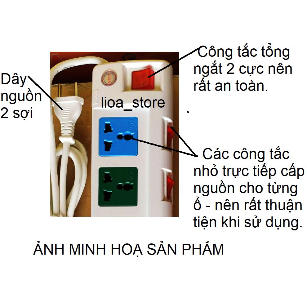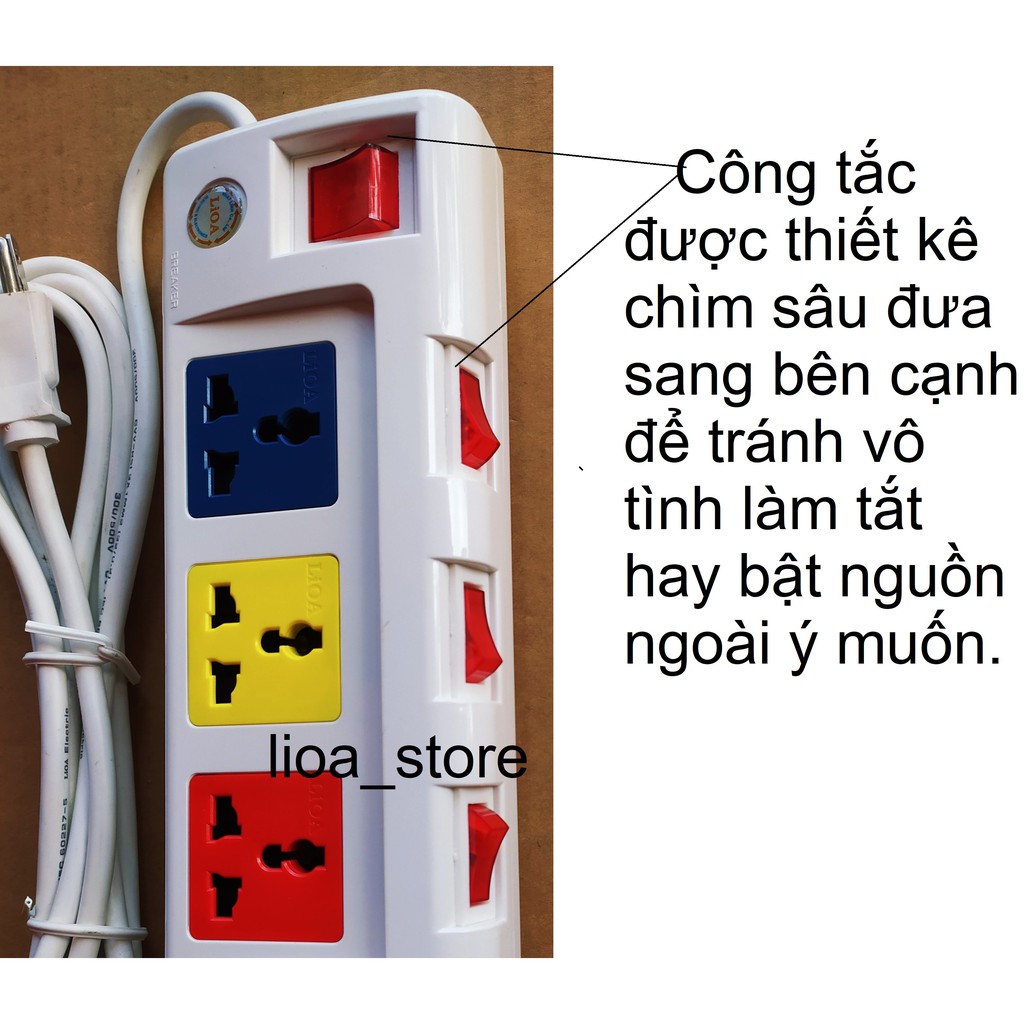 -Thân ổ cắm màu trắng có gắn thương hiệu LiOA . Mỗi ổ cắm mang 1 màu sắc khác nhau giúp cho người sử dụng phân biệt được dễ ràng khi dùng nhiều thiết bị cùng 1 lúc. trên mỗi mặt nắp nhựa ổ cắm đều có chữ LiOA. ( để tránh hàng giả hàng nhái)., các ổ cắm dều có nắp che AN TOÀN . ( tránh trường hợp nhà có trẻ con vô ý thò tay vào ổ cắm khi đang có điện . khoảng cách giữa các ổ là đảm bảo cắm được các phích có bản to.