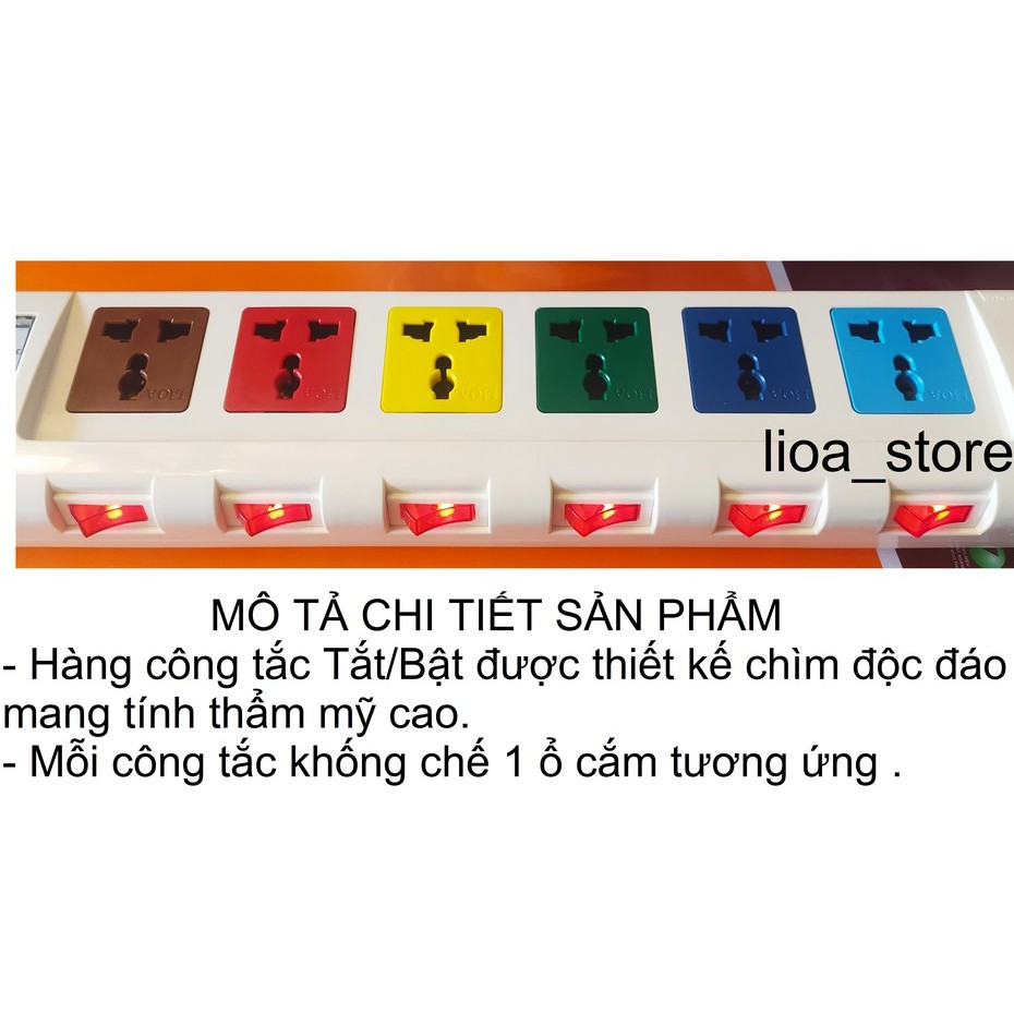 -Thân ổ cắm màu trắng có gắn thương hiệu LiOA . Mỗi ổ cắm mang 1 màu sắc khác nhau giúp cho người sử dụng phân biệt được dễ ràng khi dùng nhiều thiết bị cùng 1 lúc. trên mỗi mặt nắp nhựa ổ cắm đều có chữ LiOA. ( để tránh hàng giả hàng nhái)., các ổ cắm dều có nắp che AN TOÀN . ( tránh trường hợp nhà có trẻ con vô ý thò tay vào ổ cắm khi đang có điện . khoảng cách giữa các ổ là đảm bảo cắm được các phích có bản to.