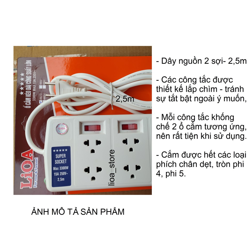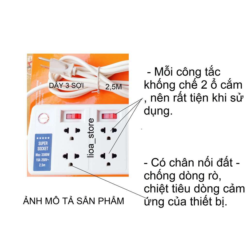 -Thân ổ cắm màu trắng có gắn thương hiệu LiOA . ( để tránh hàng giả hàng nhái)., các ổ cắm dều có nắp che AN TOÀN . ( tránh trường hợp nhà có trẻ con vô ý thò tay vào ổ cắm khi đang có điện . khoảng cách giữa các ổ là đảm bảo cắm được các phích có bản to.
