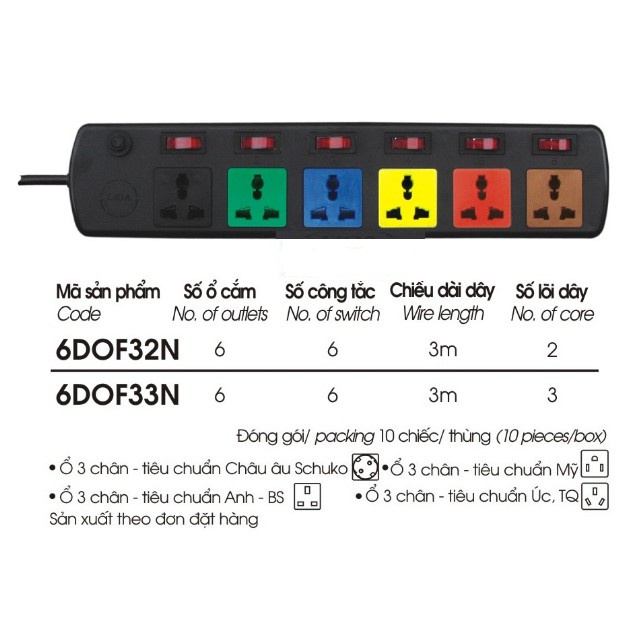 Giới thiệu Ổ cắm LiOA 6 ổ 6 công tắc dây 3 mét 6DOF32N- Hàng Chính Hãng