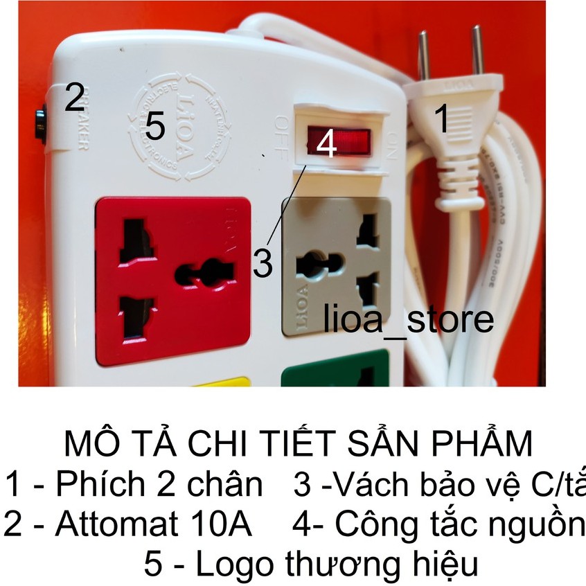 -Thân ổ cắm màu Trắng có gắn thương hiệu LiOA . Mỗi ổ cắm mang 1 màu sắc khác nhau giúp cho người SD phân biệt dc dễ ràng khi dùng nhiều thiết bị cùng 1 lúc. trên mỗi mặt nắp nhựa ổ cắm đều có chữ LiOA. ( để tránh hàng giả hàng nhái).ĐẶC BIỆT là các ổ cắm dều có nắp che AN TOÀN . ( tránh trường hợp nhà có trẻ con vô ý thò tay vào ổ cắm khi đang có điện . khoảng cách giữa các ổ là đảm bảo cắm dc các phích có bản to.