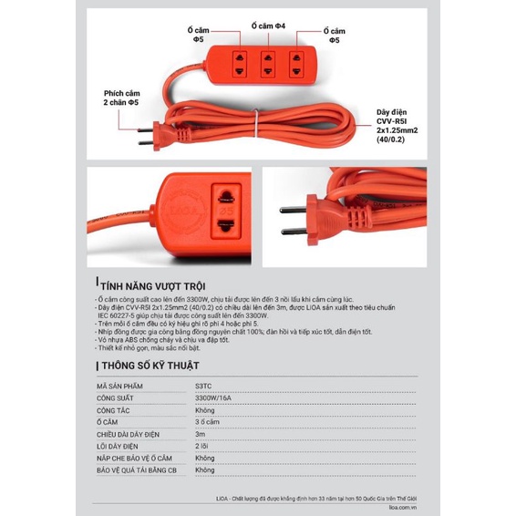 Giới thiệu Ổ cắm Lioa công suất cao 3.300w 3m S3TC