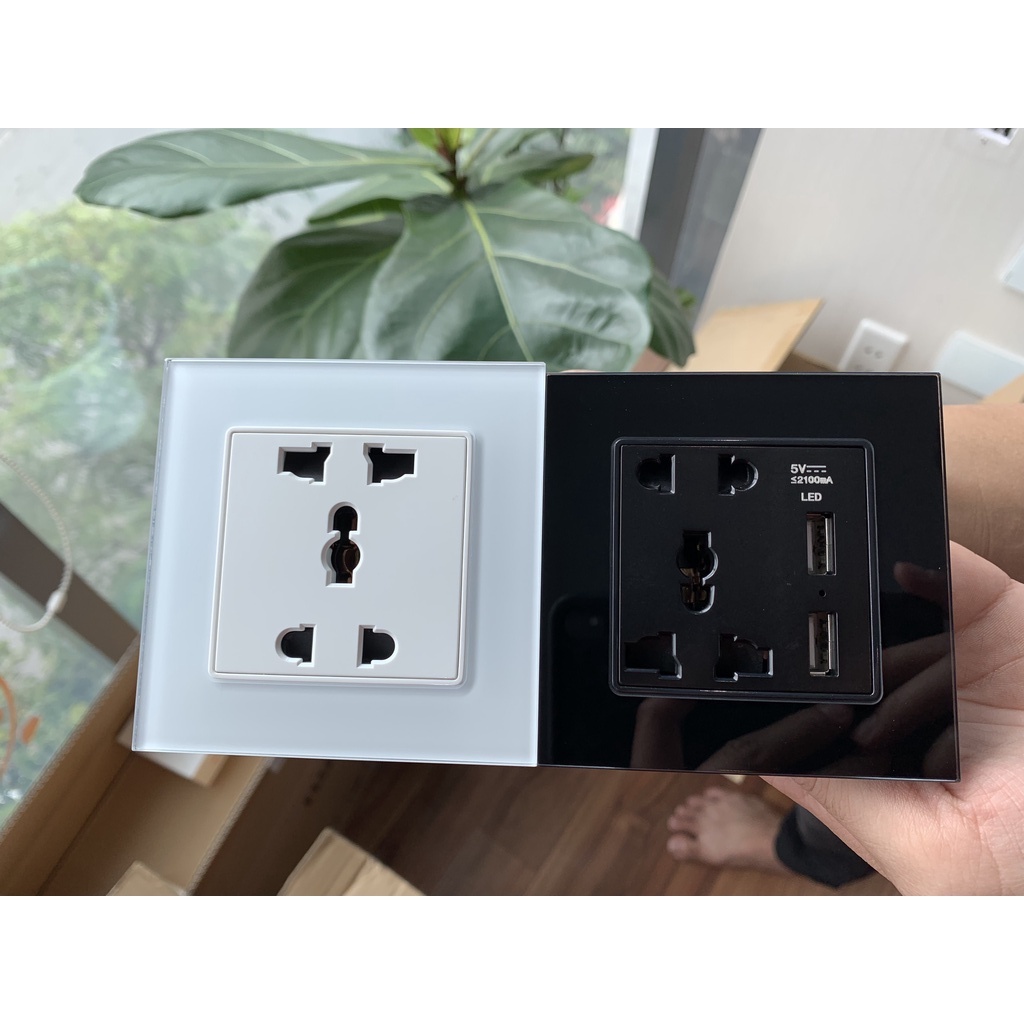 Ổ Cắm Mặt Kính Cường Lực Full Kính Hình Vuông/Có 2 Chân USB Không Có Nút Bấm Trên Mặt Ổ CắmỔ cắm điện đôi 3 chấu hỗ trợ chuẩn cắm châu âu