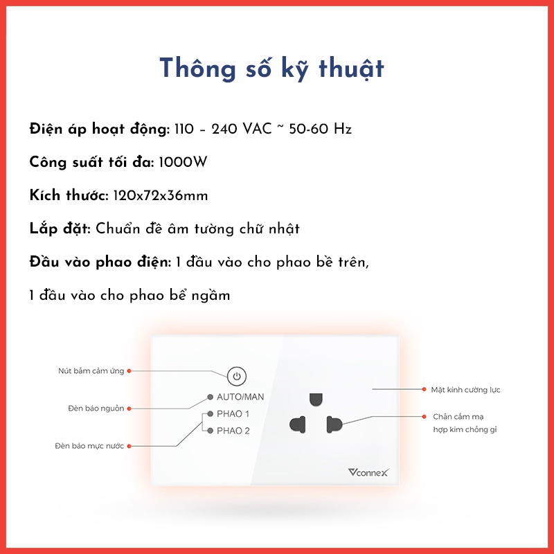 Giới thiệu Ổ Cắm Máy Bơm Tích Hợp Chuyển Nguồn Phao Điện 220V Sang 5V - Chuẩn Đế Âm Tường Chữ Nhật Lắp Đặt Dễ Dàng - Bảo Hành 2 Năm
