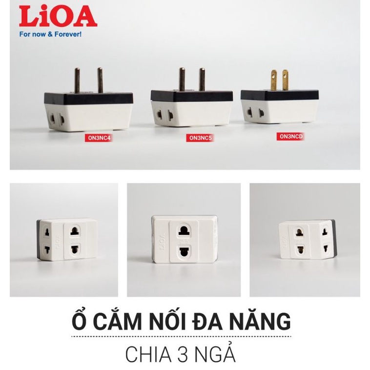 Ổ cắm nối chia 3 ngã LIOA, chân cắm tròn, chân phi 4, phi 5 , chân cắm dẹt - ON3NC4 - ON3NC5 - ON3NCDSản phẩm của Lioa , hàng Việt Nam chất lượng cao .