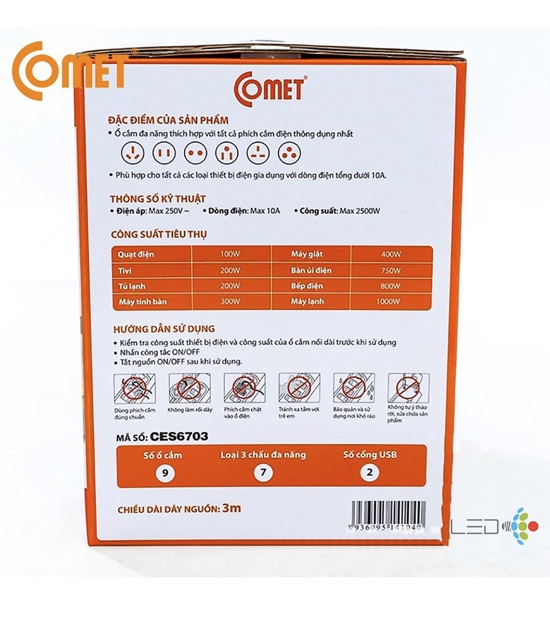 Thông số kỹ thuật Ổ cắm nối dài có cổng USB Comet CES6703:Thương hiệu CometModel CES6703