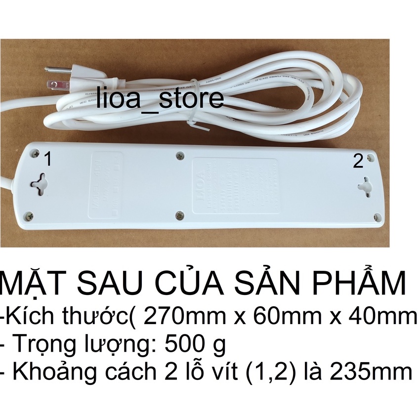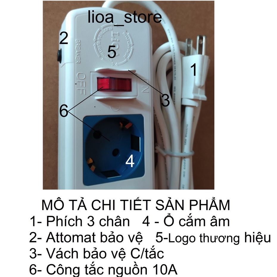 -Thân ổ cắm màu (đen và trắng) có gắn thương hiệu LiOA . Mỗi ổ cắm mang 1 màu sắc khác nhau giúp cho người SD phân biệt được dễ ràng khi dùng nhiều thiết bị cùng 1 lúc. trên mỗi mặt nắp nhựa ổ cắm đều có chữ LiOA. ( để tránh hàng giả hàng nhái).ĐẶC BIỆT là các ổ cắm dều có nắp che AN TOÀN . ( tránh trường hợp nhà có trẻ con vô ý thò tay vào ổ cắm khi đang có điện . khoảng cách giữa các ổ là đảm bảo cắm dc các phích chuẩn ÂU.