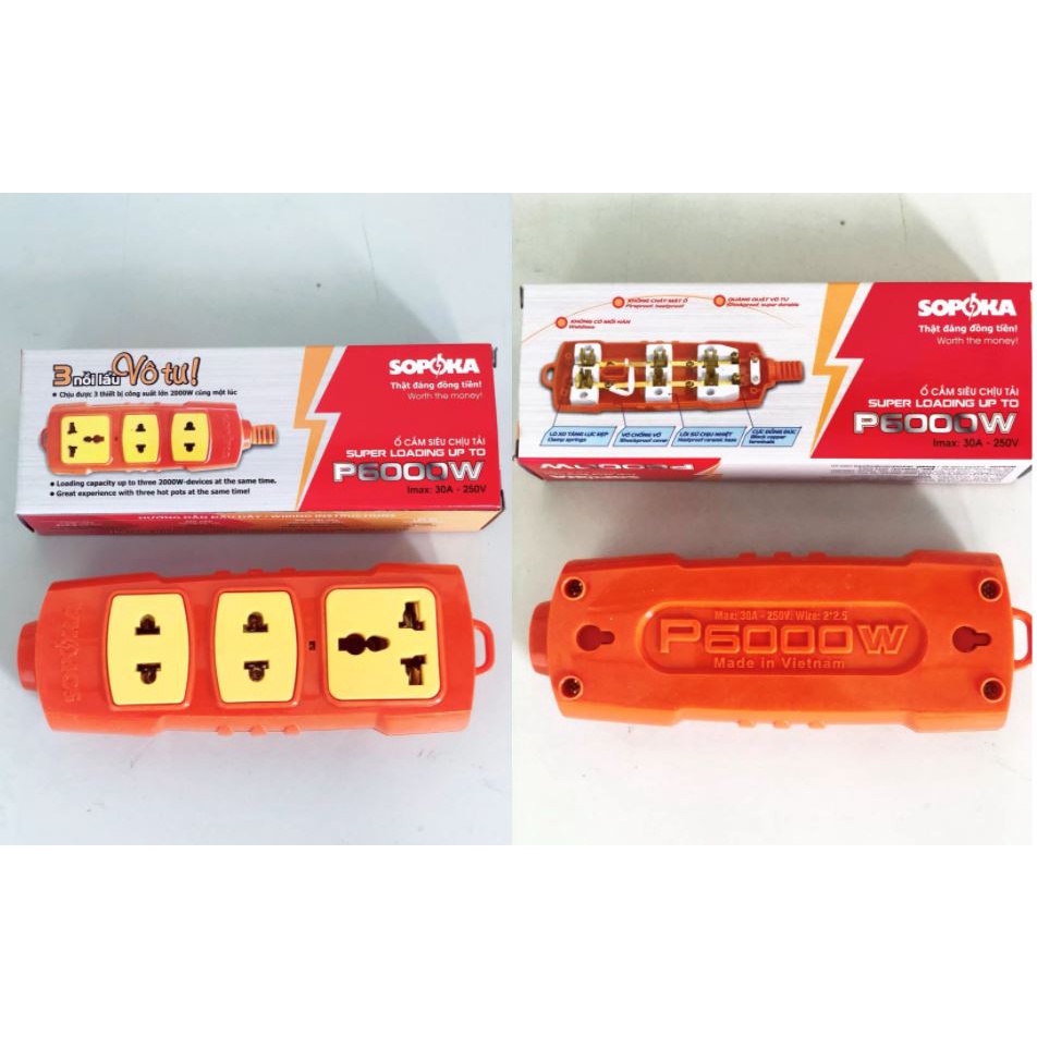 ⭐⭐Thông tin sản phẩm: Ổ cắm siêu chịu tải 3 lỗ Sopoka P6000W- Chịu tải cao: Dòng ổ cắm này được thiết kế đặc biệt để chịu được các thiết bị có công suất cao đến 6000W tương đương cắm được 3 nồi lẩu cùng một lúc, hình dáng đẹp, cứng cáp, màu cam nổi bật đặc trưng.