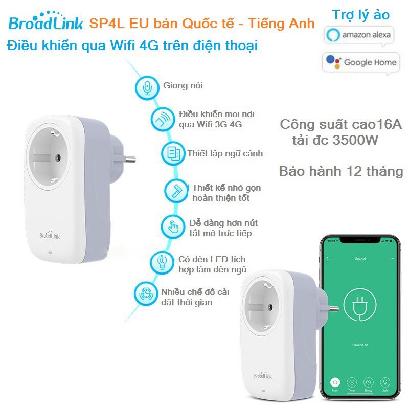 Ổ cắm thông minh Broadlink SP4L EU 16A tải 3500W điều khiển qua Wifi 4G Bản quốc tế