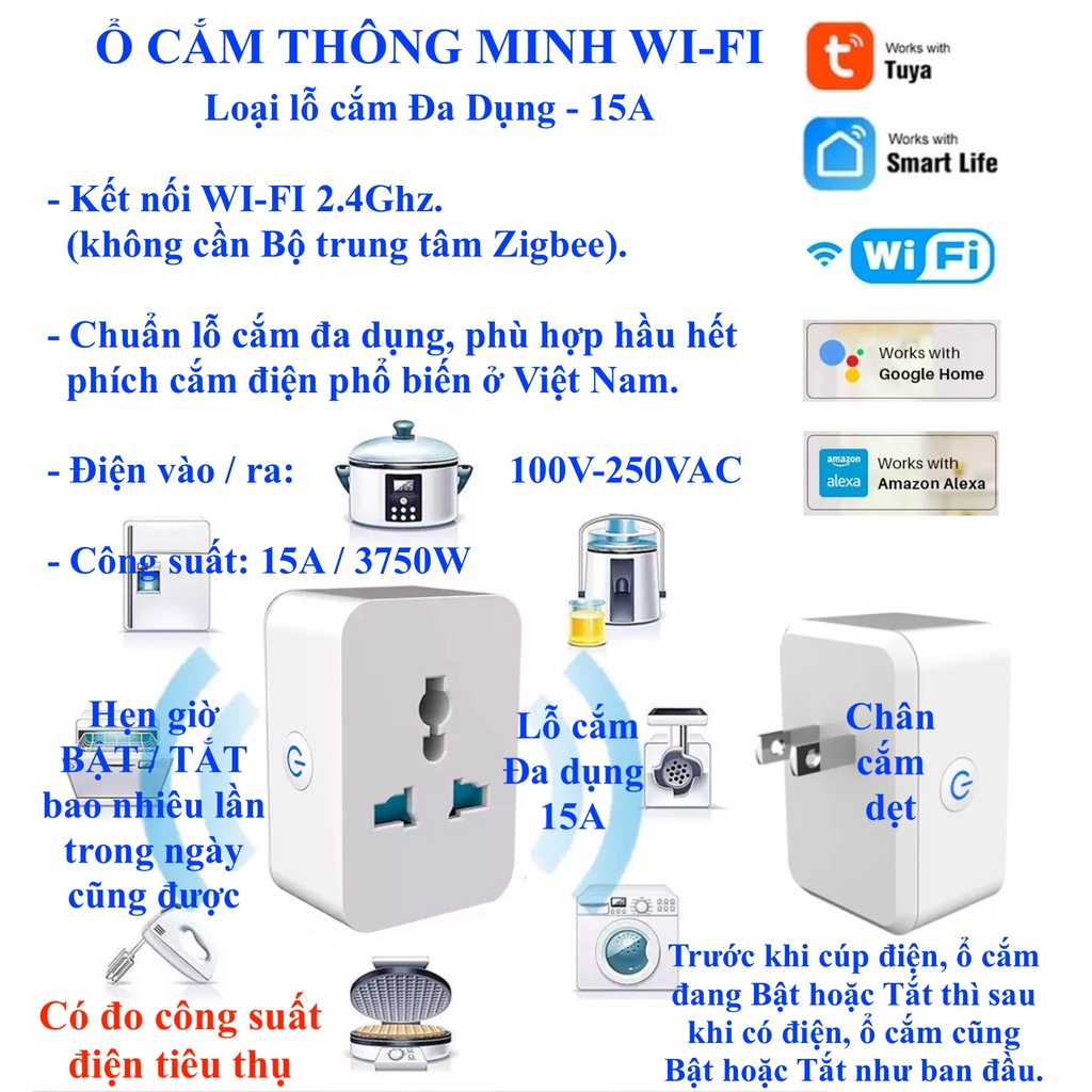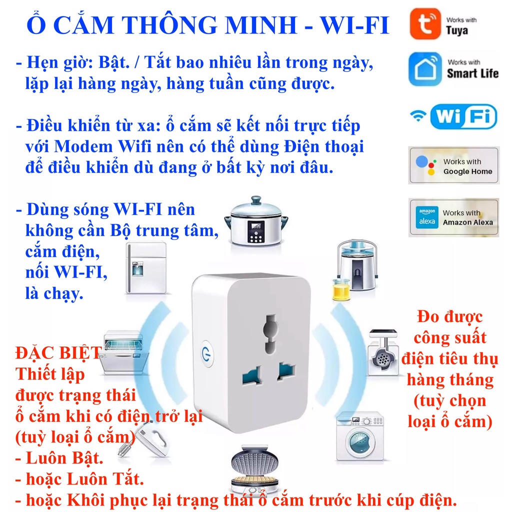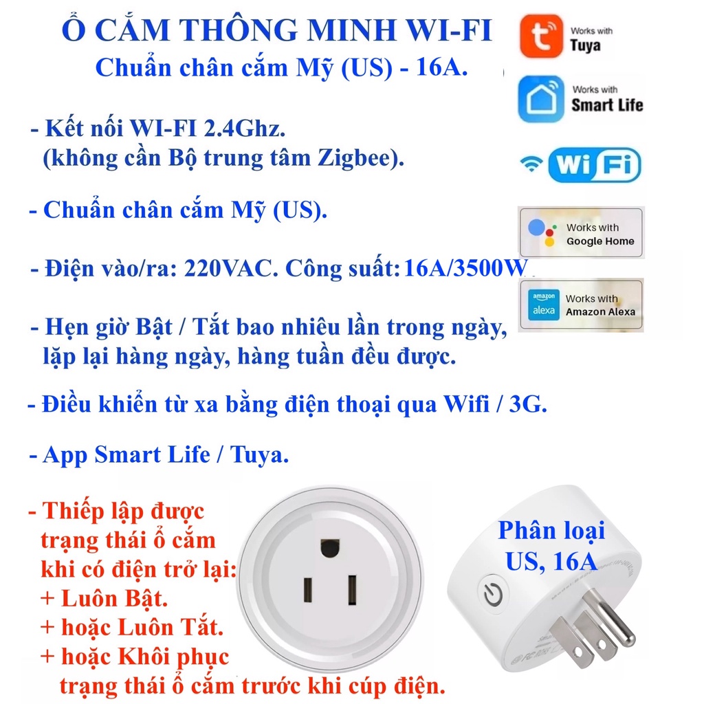 Ổ cắm Thông minh Kết nối WI-FI các loại, công suất từ 10A đến 16A, Hệ sinh thái Tuya.Điều khiển bằng App Smart Life/ Tuya, tương thích Google Assistant, Alexa.