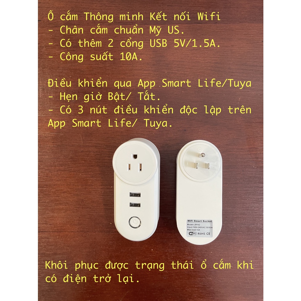 - Ổ cắm điện và 2 ổ cắm USB có 3 nút điều khiển độc lập trên App Smart Life/ Tuya.