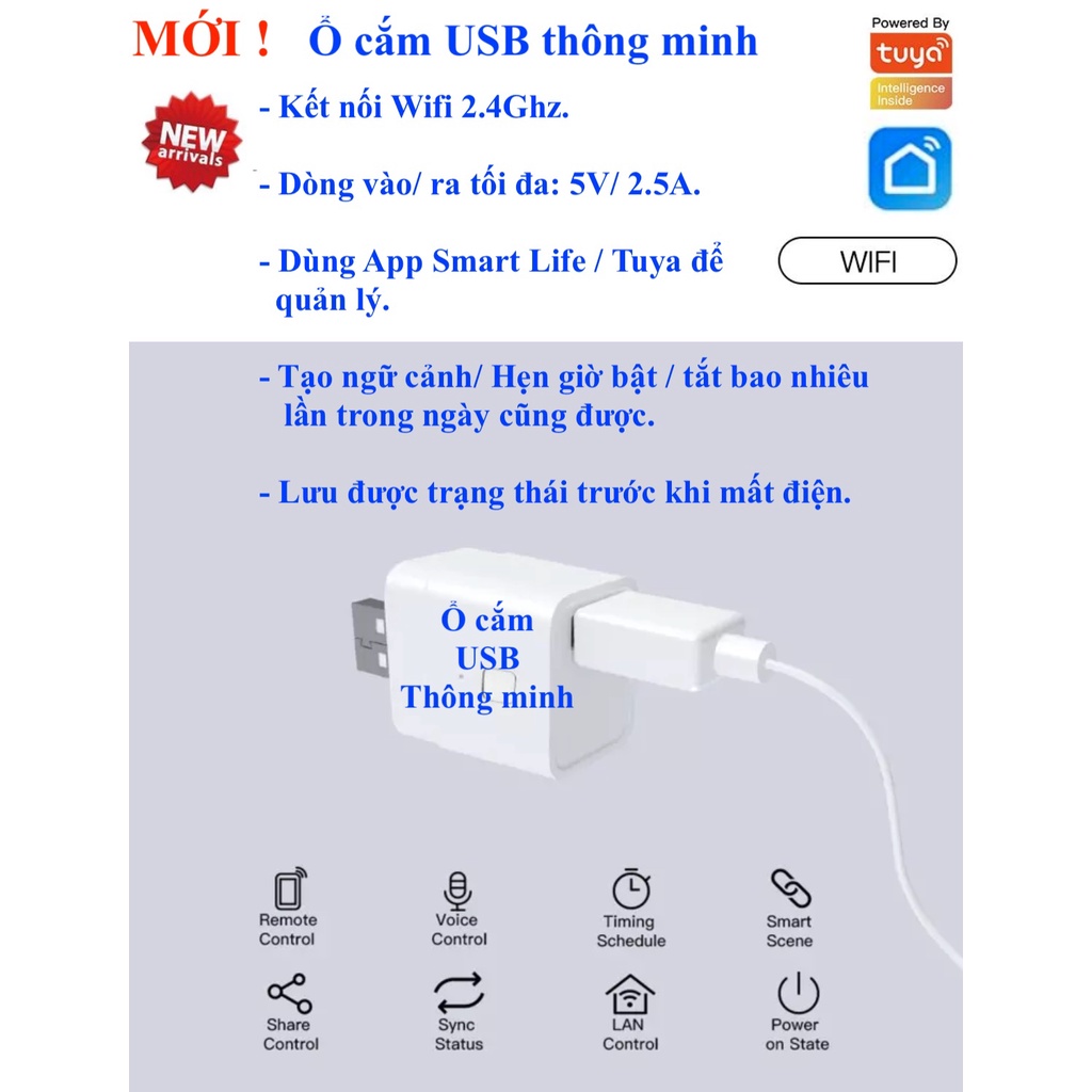 - Có 4 ổ cắm USB, công suất 2A/ ổ, điều khiển Tắt/ Mở đồng thời 4 ổ USB trên App Tuya.