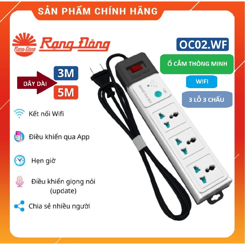 Thiết Bị Điện Gia Dụng > Mạch điện & Phụ tùng > Ổ cắm điện & Dây nối || Ổ Cắm Thông Minh Wifi Rạng Đông OC02.WF - 3 lỗ 3 chấu - dây dài 3m đến 5m - Chức Năng Hẹn Giờ, Điều Khiển Từ XaCòn hàng