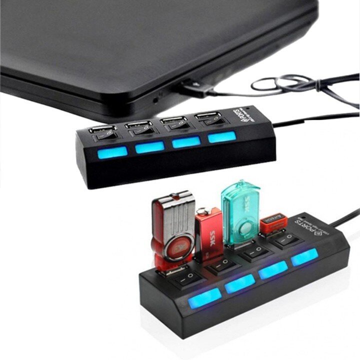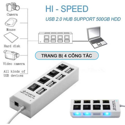 - Bộ chia cổng USB Hub 4 port dùng để chuyển 1 cổng USB của máy tính thành 04 cổng USB hỗ trợ sử dụng tối đa 4 usb cho các thiết bị như như chuột, bàn phím , usb, đầu đọc thẻ, Webcam, Máy in, Máy quét, micro usb, sound card usb, ổ đĩa CD/DVD gắn ngoài, ổ đĩa cứng gắn ngoài, … hoặc dùng sạc điện thoại (lưu ý chỉ sạc được điện thoại khi cắm HUB vào nguồn usb có điện năng mạnh như cốc sạc điện thoại hoặc ổ cắm sạc usb, không thể sạc được thông qua nguồn của máy tính, laptop)