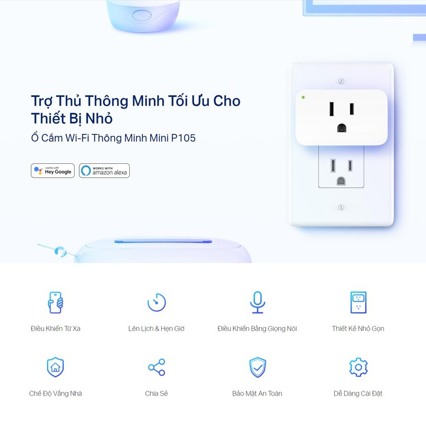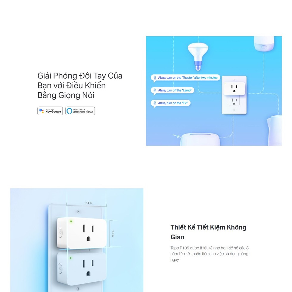 - Điều Khiển Bằng Giọng Nói – Quản lý phích cắm thông minh của bạn bằng lệnh thoại qua Amazon Alexa hoặc Trợ lý Google
