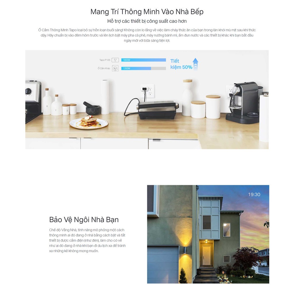 - Hỗ Trợ Thiết bị Công Suất Cao hơn – Lên lịch cho ấm đun nước, máy pha cà phê và máy nướng bánh mì của bạn để thưởng thức bữa sáng "cài đặt sẵn"
